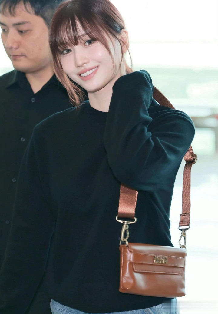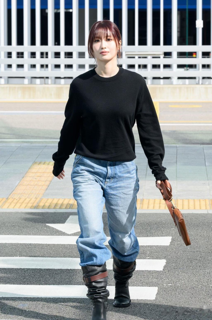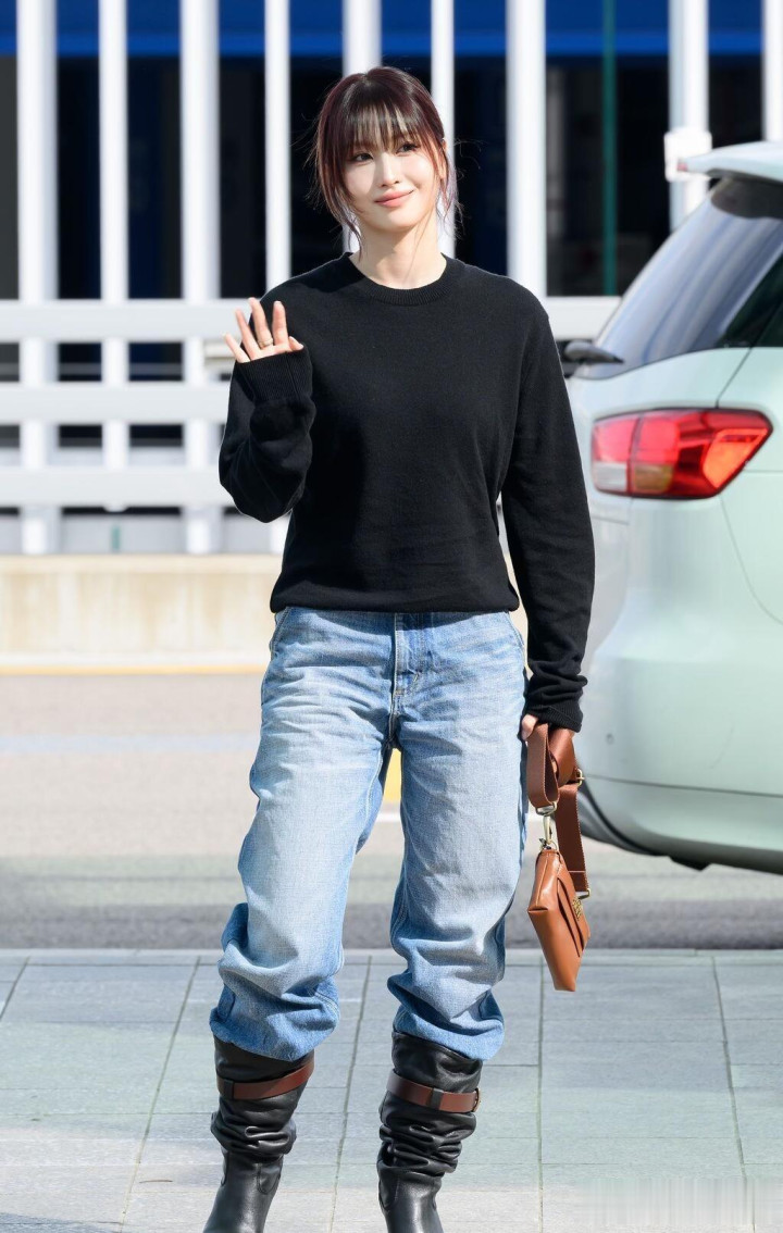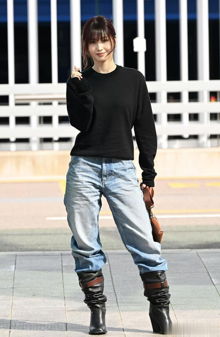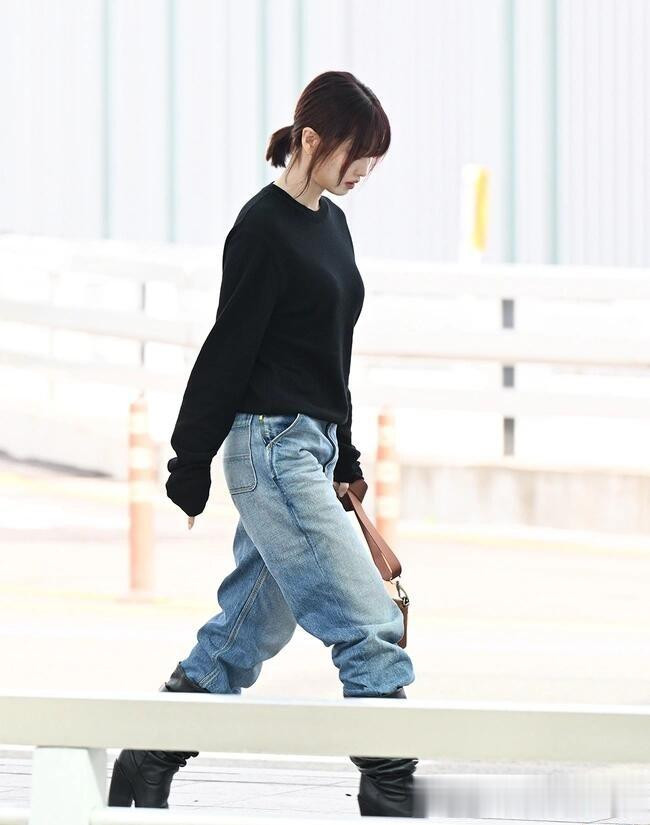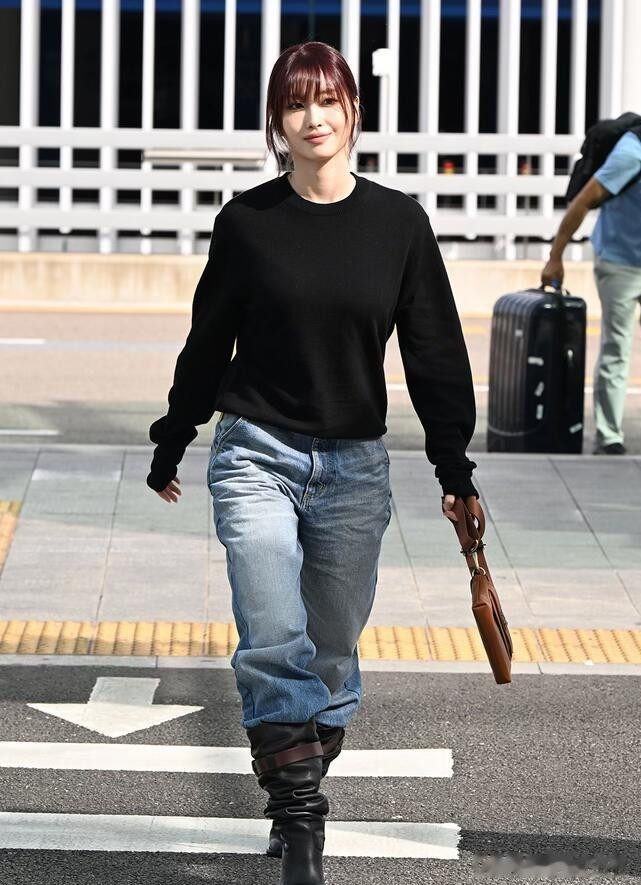 平井桃前往米兰时装周, 穿黑色针织衣配牛仔裤, 皮肤白皙透亮好美